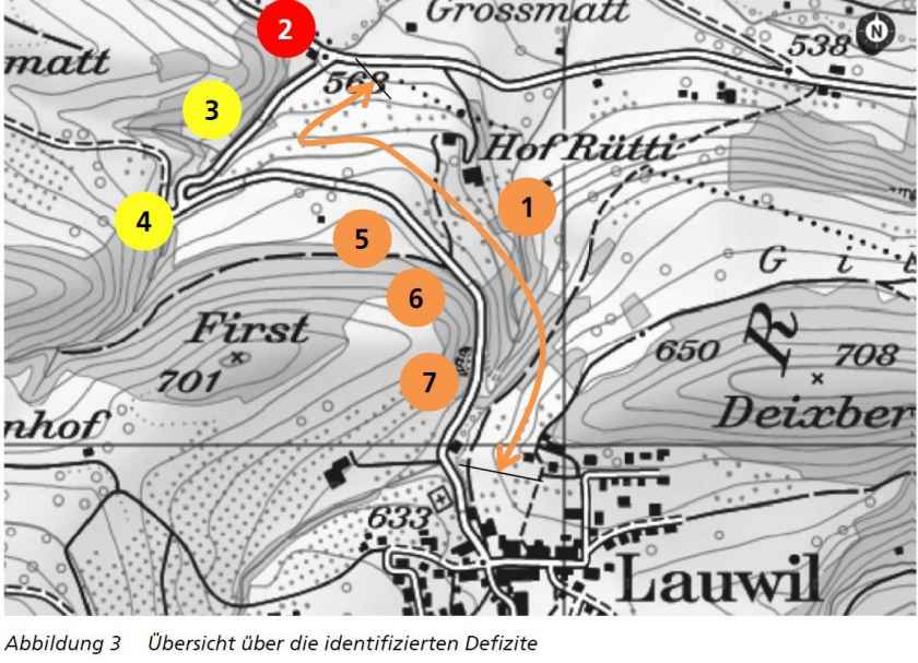 Die Untersuchung hatte zum Ziel, Sicherheitsdefizite zu identifizieren und Massnahmen für deren Behebung oder Abschwächung vorzuschlagen. Das Vorgehen, „Road Safety Inspection“(RSI) genannt, basiert auf der VSS-Regel SNR 641 723 „Strassenverkehrssicherheit –Inspektion“. Die Erkenntnisse konnten anschliessend direkt in das Instandstellungsprojekt einfliessen.