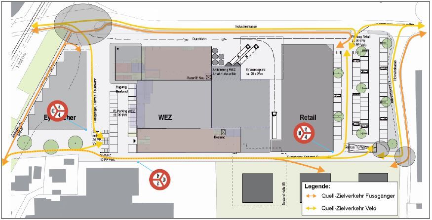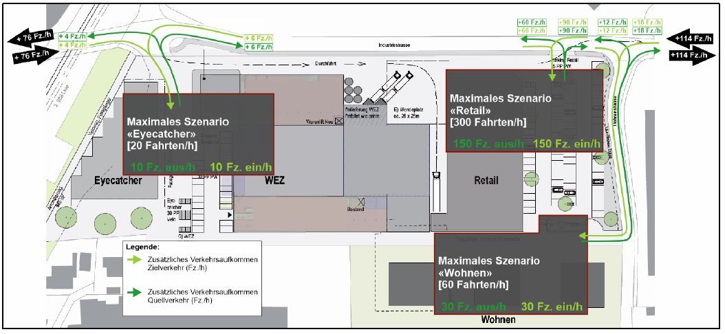 Auf einer Parzelle in Oberentfelden, AG wird ein Umbau eines Industriegeländes inkl. neuen Verkaufsgeschäften und Wohnparzellen geplant. Für dieses bauliche Grossvorhaben ist ein verkehrstechnischer Bericht notwendig, welcher von der SWISSTRAFFIC AG erstellt wird. Dabei werden die nötigen Parkplatzanlagen berechnet und geplant. Der daraus entstehende zusätzliche Verkehr wird für eine durchschnittliche Spitzenstunde berechnet. Daraus kann der verkehrliche Effekt auf das bestehende Strassennetz abgeschätzt werden. Damit keine Verkehrsbeeinträchtigungen auf dem bestehenden Strassennetz entstehen, werden Massnahmen (Knotengeometrien, Sichtverhältnisse, Konzepte) vorgeschlagen.