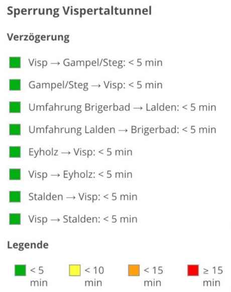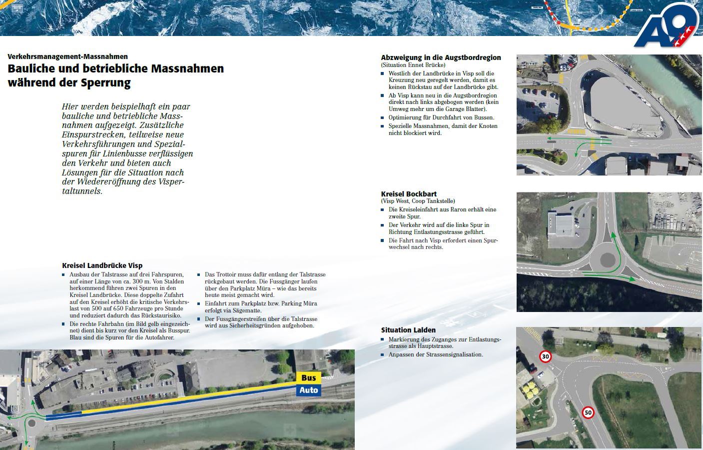 Das Amt für Nationalstrassen des Kantons Wallis hat SWISSTRAFFIC beauftragt, das Verkehrsmanagement im Hinblick und während der 18-monatigen Schliessung des Vispertaltunnels zu übernehmen. Dieses beinhaltet die Ausarbeitung inkl. Ausführung der Verkehrsmassnahmen, Teile der Kommunikation inkl. einer Homepage www.vispertaltunnel.ch und die Messung der Verlustzeiten in Echtzeit mit BlueScan in der Region um Visp.