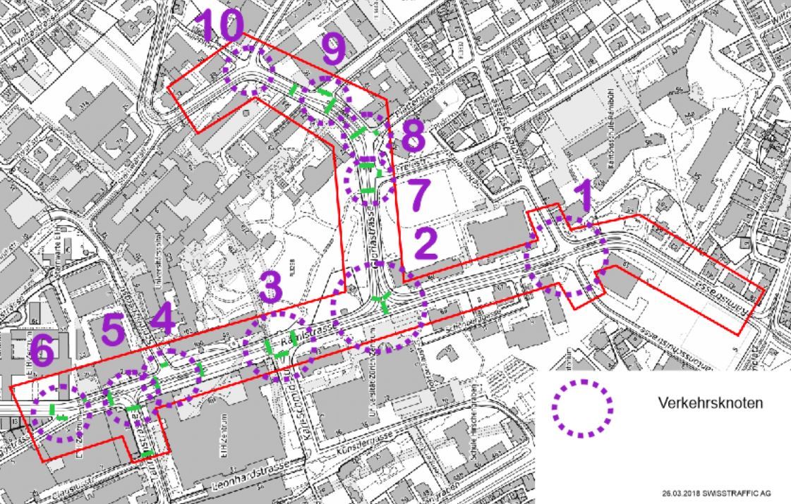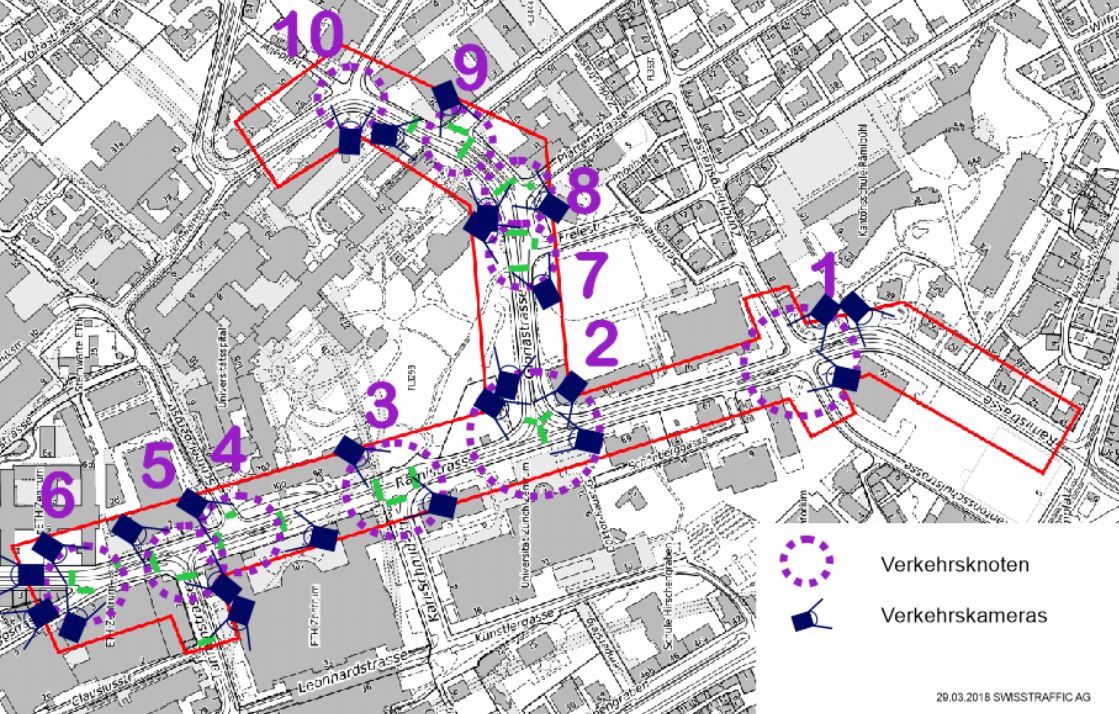 Verkehrszählung an zwei Werktagen während der erweiterten Spitzenstunden Morgen und Abend mit der Erfassung des MIV, Rückstaulängen, Radverkehr und Fussverkehr entlang der Rämi- und der Gloriastrasse. Die Resultate fliessen anschliessend direkt in das VISSIM-Modell ein.